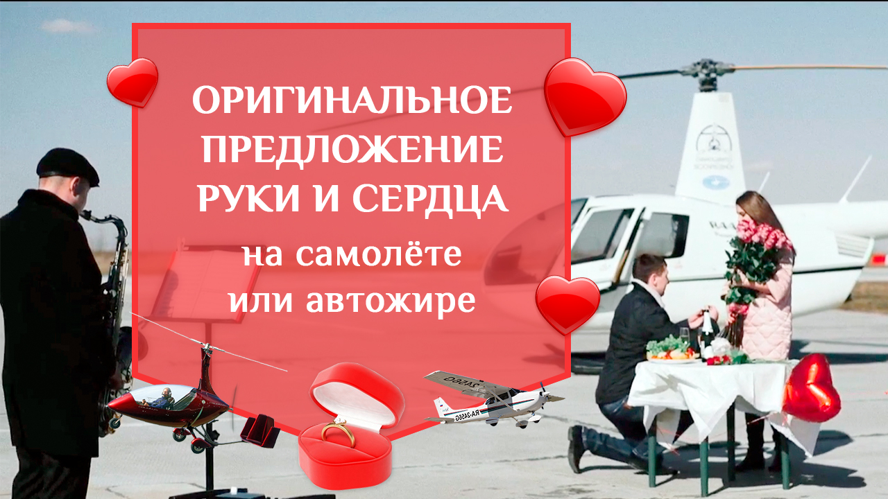 Давайте вместе пофантазируем о том, каким может быть ваше предложение руки и сердца. Вы вместе отправляетесь в красивый полёт на самолёте или параллельно на двух автожирах. С высоты птичьего полёта ваша любимая видит на взлётной полосе надпись «Выходи за меня», выложенную из цветов. Вы приземляетесь у шатра, оформленного специального для вашей пары, внутри музыканты играют романтические мелодии и накрыт праздничный стол только для вас двоих. Вы дарите красивый букет и ждёте самого важного ответа в жизни. А когда ваша возлюбленная ответит «Да», то в вечернем небе загрохочет праздничный салют. И всё это волшебное приключение сможет быть запечатлено в виде фильма или фото-сессии, с которой начнётся ваш совместный семейный альбом.